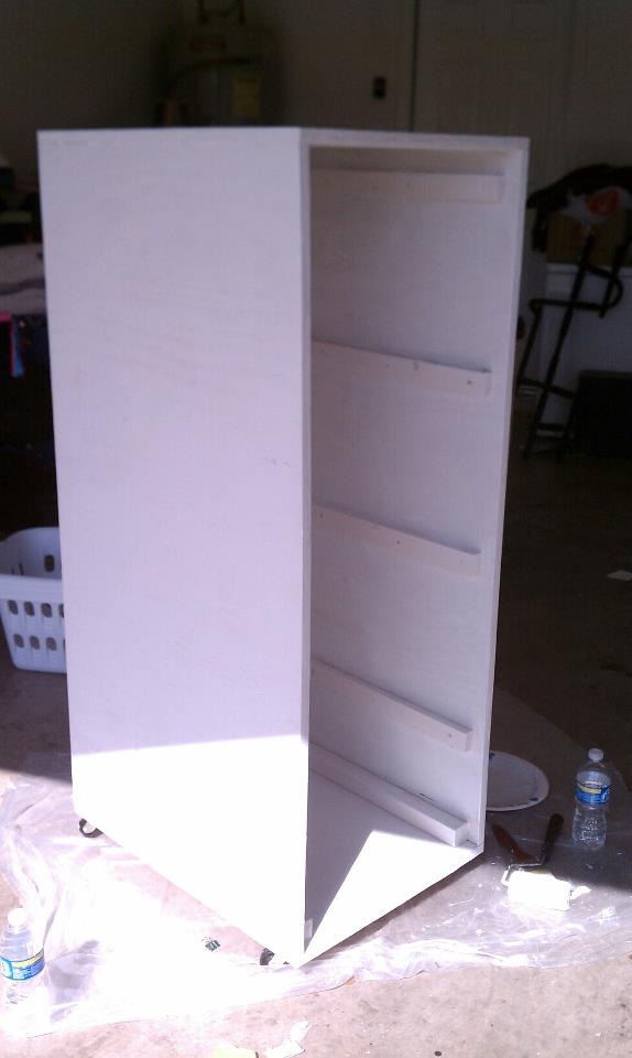 I hate sanding. I really do. Sanding by hand makes your arms ache after five minutes and sanding with an orbital sander makes your hands numb after two. I really just need a sandblaster, I think. But I sanded this beast inside and out, going over and over the raw edges of the plywood so that I wouldn't have any splinters or rough spots. Then, because I learned my lesson from the bathroom dresser, I primed it, inside and out.